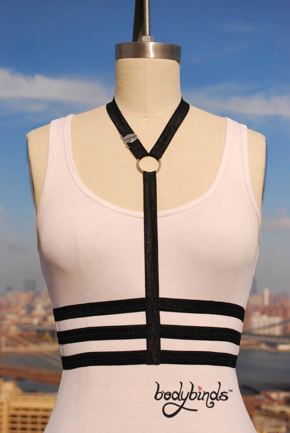 There is also the option to add lots of straps to appease the needs of form as well as function. There are many forms of harnesses that merit consideration. The first set of straps that I am considering is more about form and accents the decollage in an interesting manner, mainly by separating and highlighting the area just bellow. One thing that peaks my concerns with this arrangement is that my natural waist is small, but my ribcage is not, so if I highlight my ribcage I might be doing myself a diservice in terms of making an attractive garment that doesn't make me look like a harlot. It's never easy. My other concern is that horizontal stripes are not the most flattering on me, though the vertical strip that goes down the middle might be enough to elongate my physique.